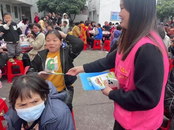 活動現場,黨員及婦聯志愿者向村民宣傳醫療保險、養老保險政策,食品安全知識,反家暴以及反詐騙等事項。